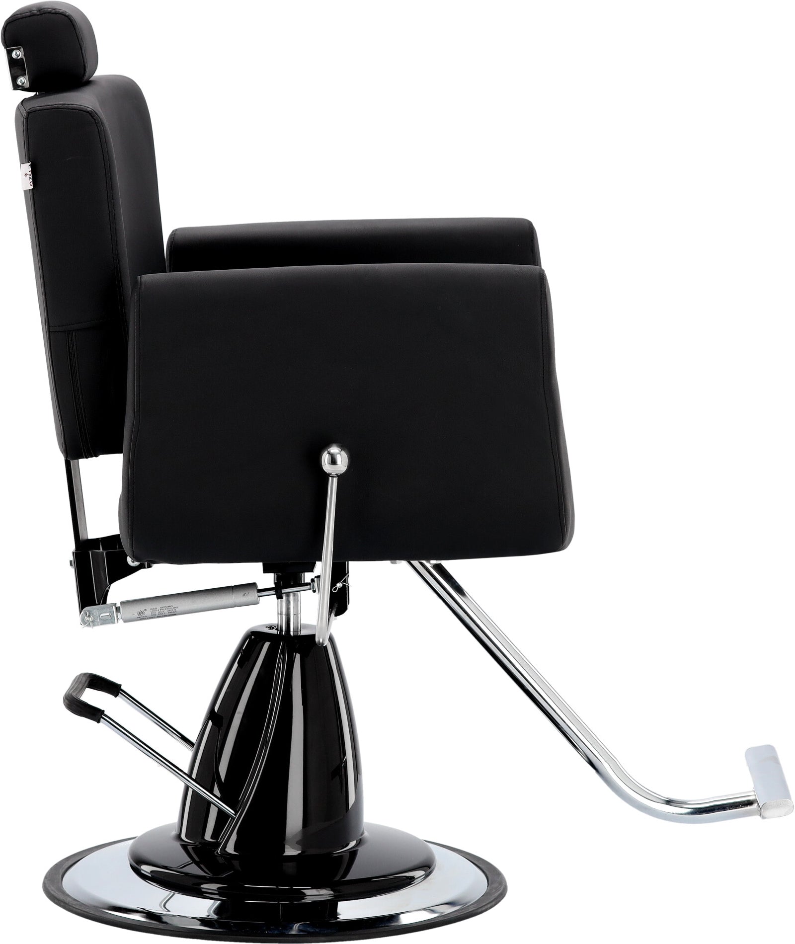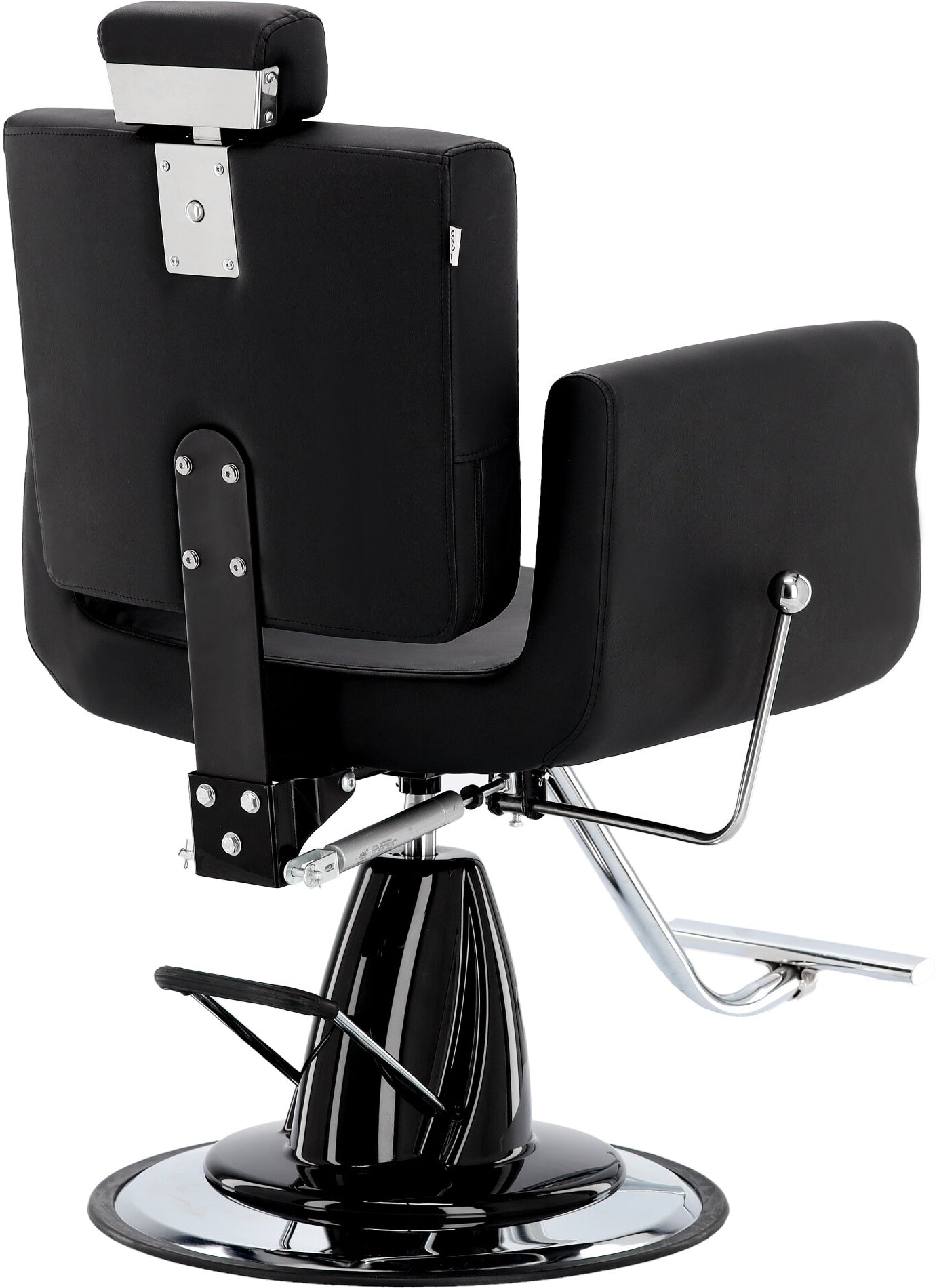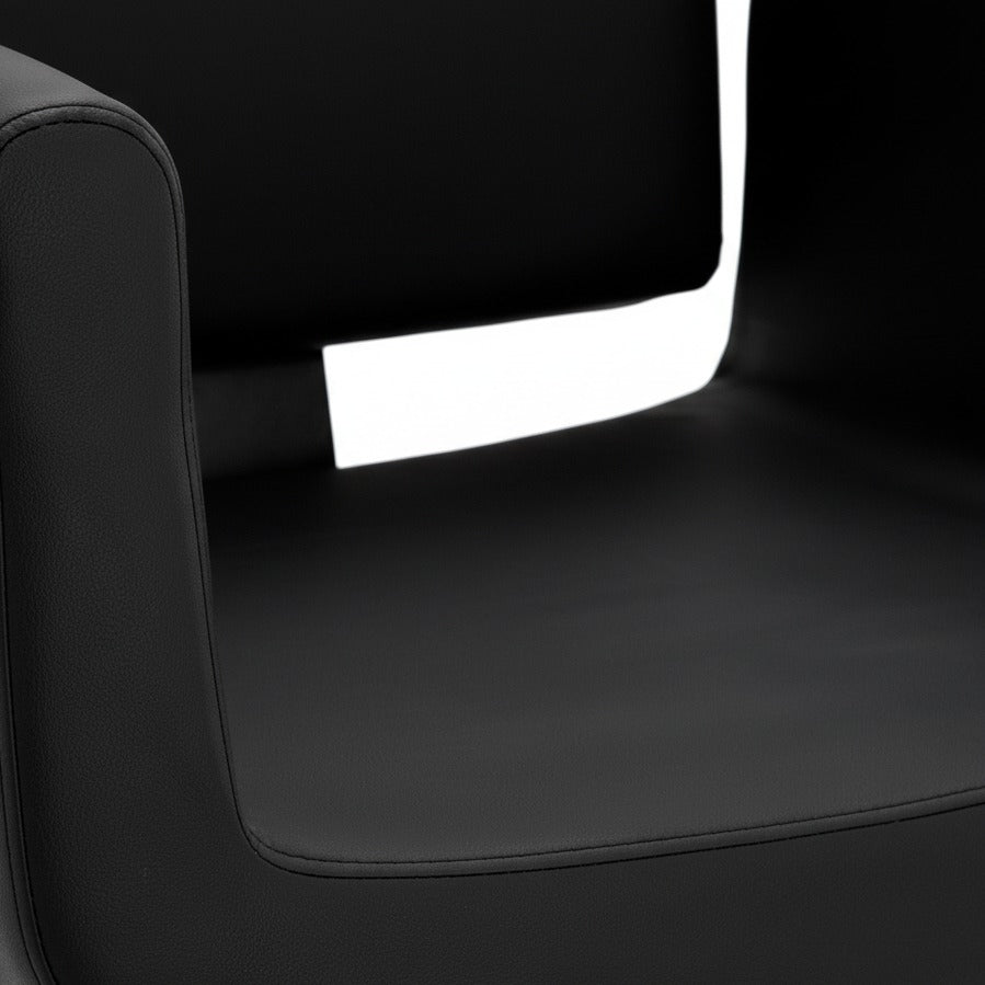 Stačiakampės formos atlošas užtikrina patogią nugaros atramą ir suteikia kėdei modernų bei elegantišką charakterį. Juoda apmušalų spalva puikiai dera su šiuolaikinių barber salonų interjeru.