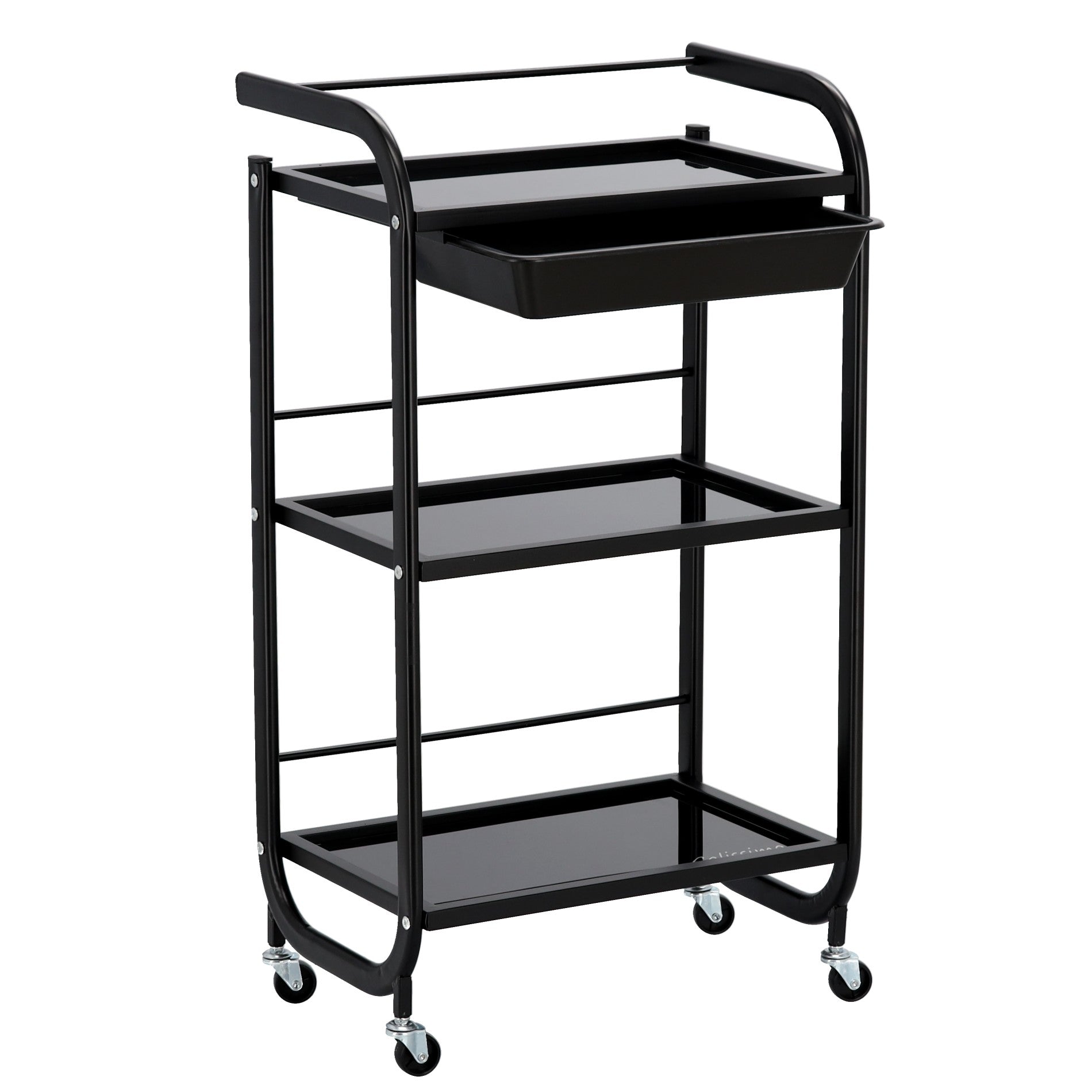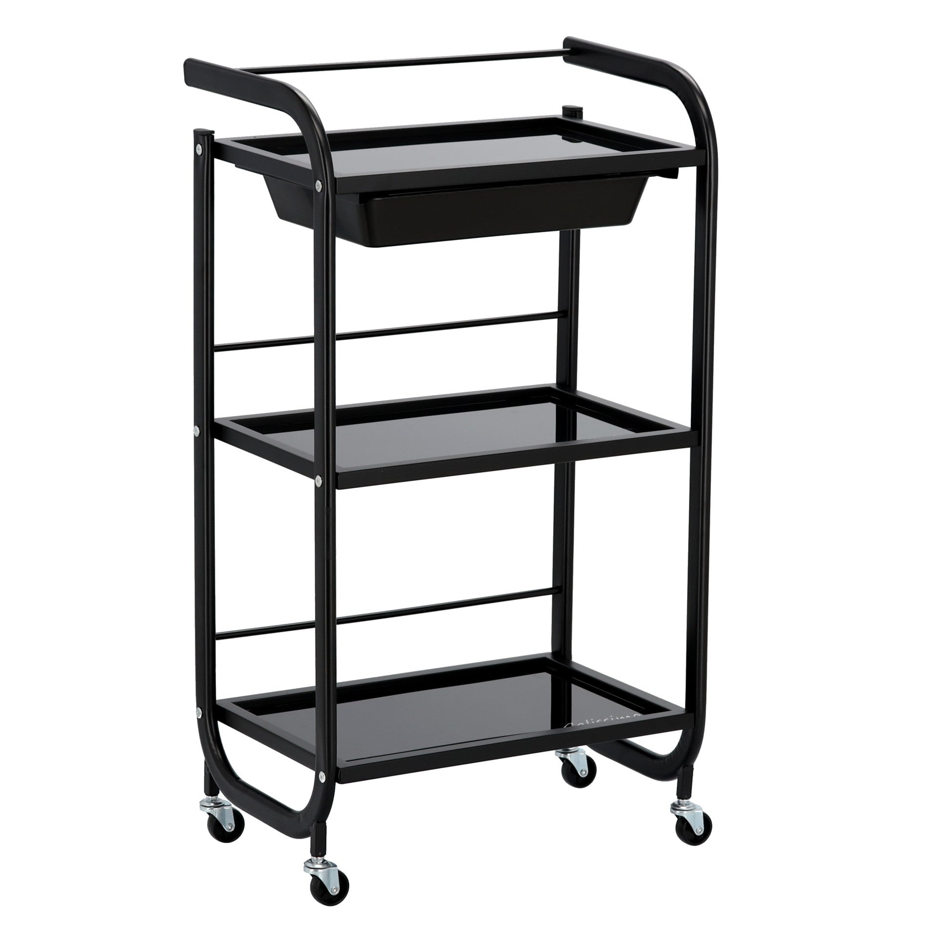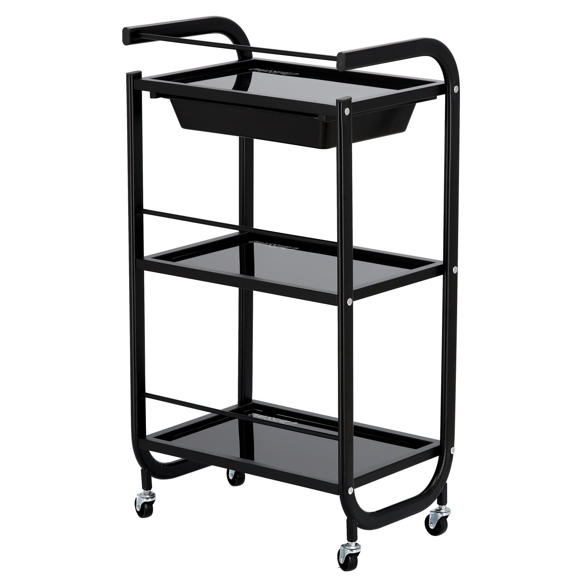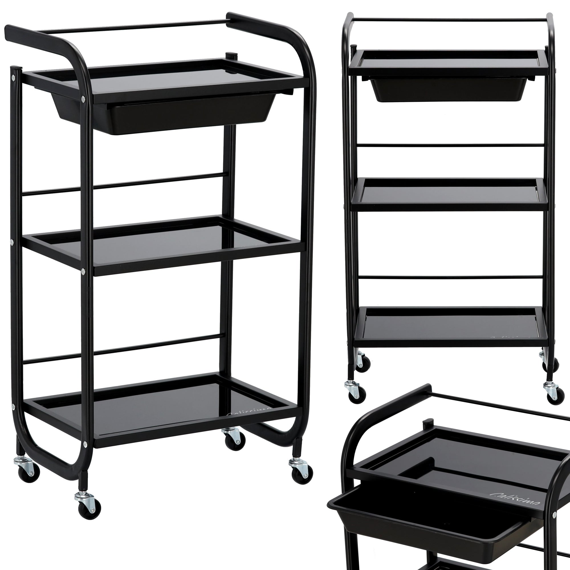 Kosmetologinis staliukas vežimėlis pagamintas iš plieninio korpuso, stiklinių lentynų ir plastikinio stalčiuko, užtikrins pakankamai vietos Jūsų įrangai bei priedams pasidėti. Vežimėlis tvirtas bei stabilus, lengvai valdomas ratukų pagalba. Korpusas dažytas milteliniu būdu.